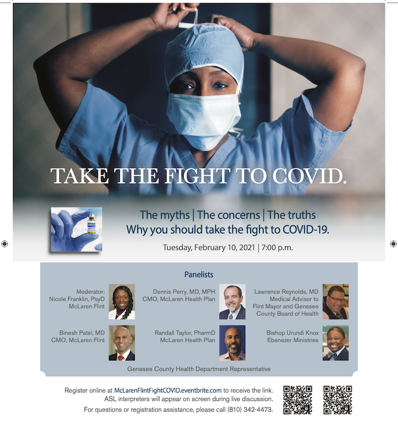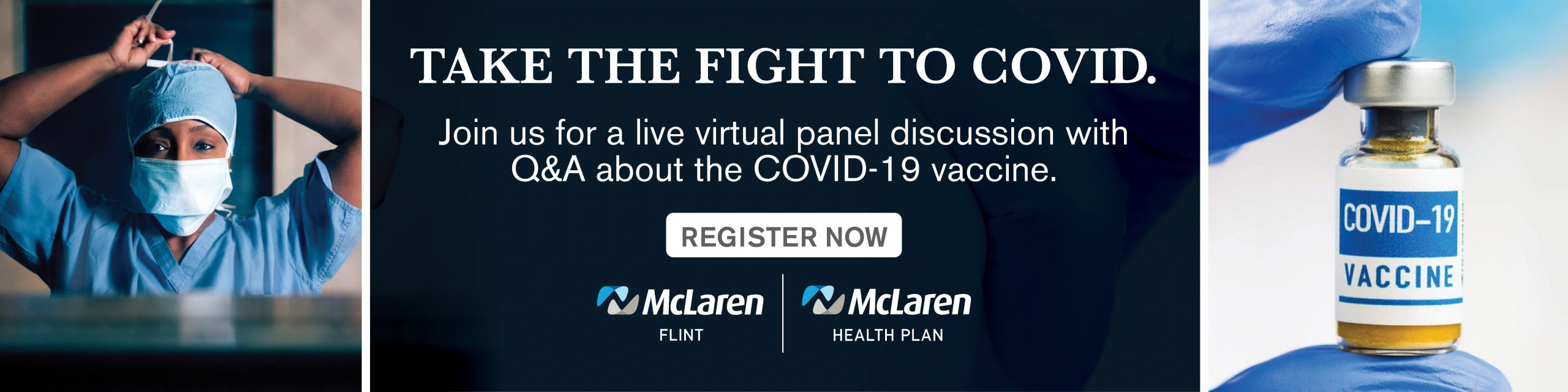 McLaren Flint and McLaren Health Plan teamed up to offer a “Take the Fight to COVID” community webinar on Feb. 10, 2021, to answer the public’s questions about COVID-19 and the vaccine rollout.
