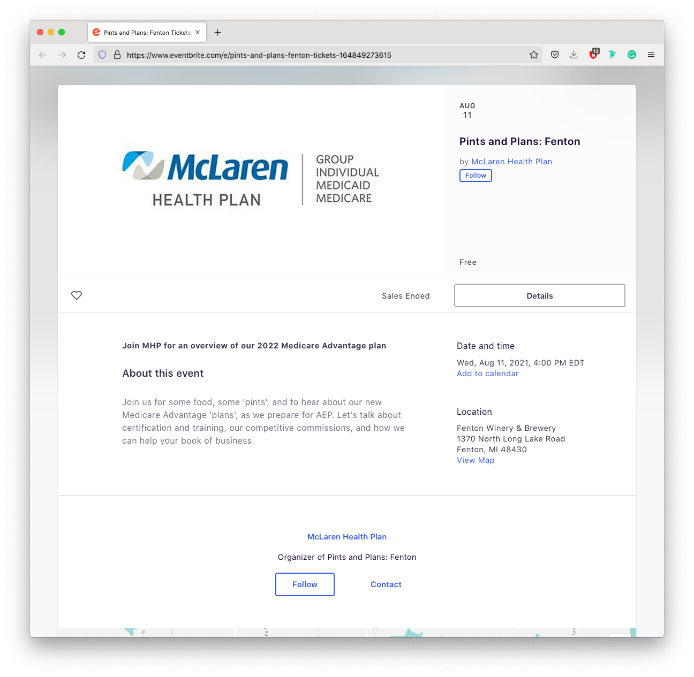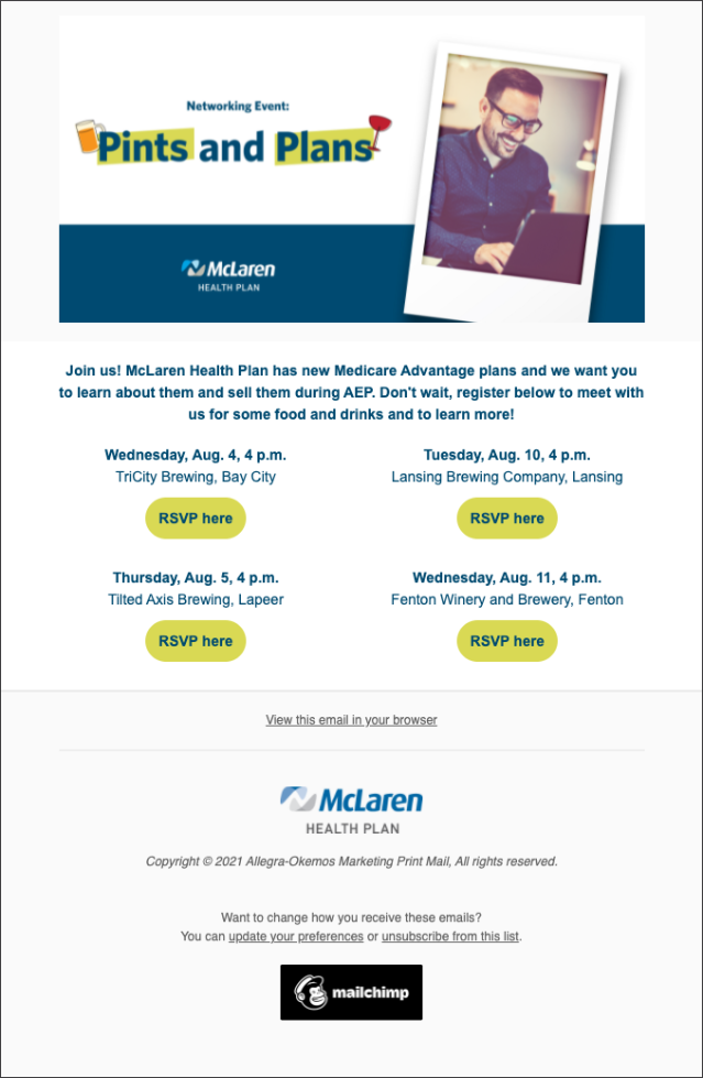 Güd Marketing worked in collaboration with Allegra-Okemos to leverage existing agent contacts for distribution of a broker-focused event announcing MHP’s entrance into the MA Marketplace. With the informal setting/backdrop of local breweries & wineries throughout Michigan, Pints & Plans was born. Four events were held throughout the state in key MHP markets: TriCity Brewing in Bay City, LBC in Lansing, Tilted Axis Brewing in Lapeer, and Fenton Winery & Brewery. Each event allowed for networking and MHP to connect directly with agents throughout the state. An Eventbrite page was also created for these and future MHP events.
